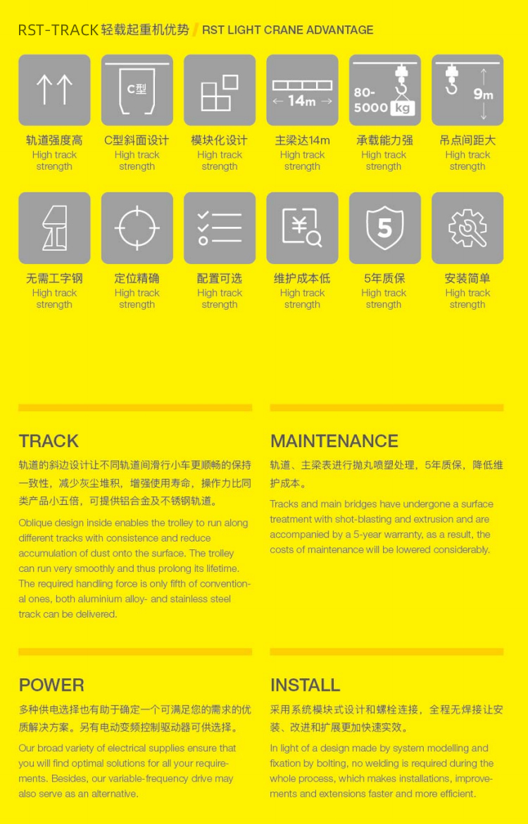 我們廣泛的軌道尺寸選擇能夠滿足從80kg到5000kg的負載需求。RST-TRACK軌道的斜邊設計能夠使得不同的軌道之間的滑行小車保持更好的一致性,并且能夠減少軌道上灰塵堆積的可能性。這也使得滑行小車在軌道上運行更加順暢,使得起重機具有更長的使用壽命。相對于它牌起重機,RST-TRACK輕載型起重機所需的操作力要小五倍。